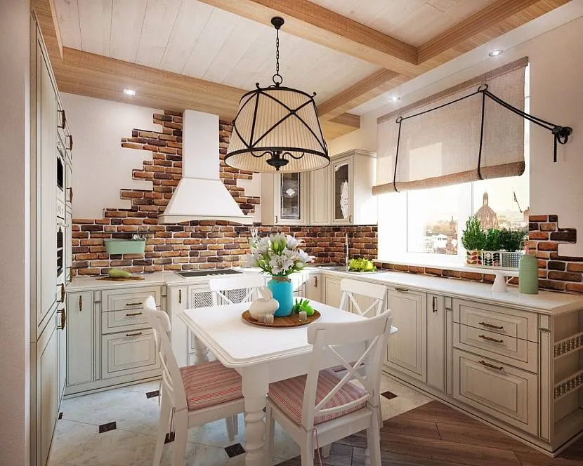 На фоне мебели молочного цвета выгодно подчеркнут кирпич, балки и полИсточник m.fotostrana.ru
