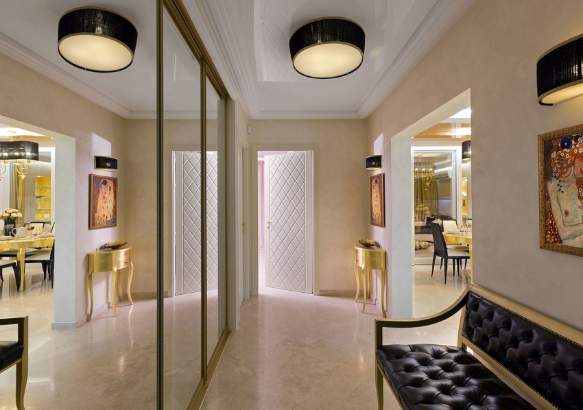 Чтобы визуально расширить площадь следует подбирать светлую отделку для стен. А с низкими потолками помогут справиться глянцевые потолки. Света должно быть много, так как в коридорах обычно темно. Точечные светильники устанавливаются по периметру, а светодиодные ленты помогут подчеркнуть зеркала или коллекцию фотографий.