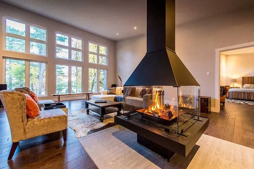 Поэтому, если все стены в комнате равномерно отдалены от центра, то лучше не использовать классический вариант камина, а остановиться на современных моделях для получения тепла. Например, отличным выходом из положения будет установка посередине гостиной декоративного биокамина. Наряду с красотой, этот инновационный девайс также обогреет пространство вокруг себя.