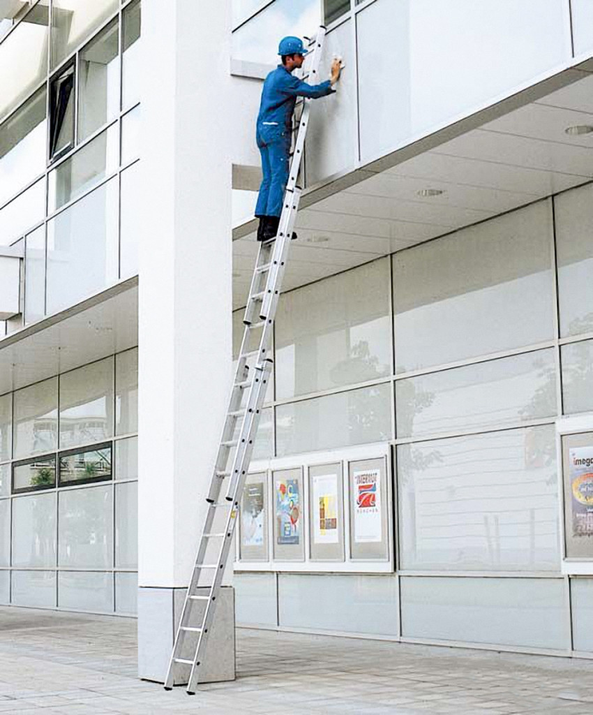 Отличную устойчивость алюминиевой лестнице обеспечивает точка опоры, ею может быть стена помещения. 3-х секционная лестница может быть в виде Л-образной стремянки, имеющей верхний дополнительный элемент. Это основной тип положения, устойчивость всего агрегата обеспечивает противоскользящая опора. 3-х секционная лестница является многовариантным устройством, она удобна в применении за счет того, что владелец может изменять ее высоту (например, садовая работа предполагает деятельность на различной высоте).