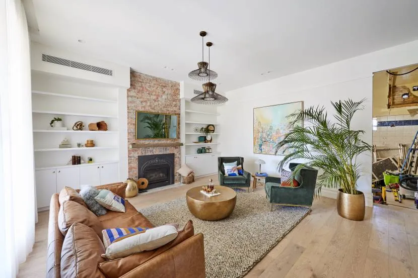 Строители демонтировали старую отделку и паркет в прихожей и гостиной. Колонну рядом со спальной зоной нарастили при помощи гипсокартона, после чего отштукатурили все стены и потолки. На полу сделали самовыравнивающую стяжку и уложили паркетную доску из европейского дуба с брашированной поверхностью.