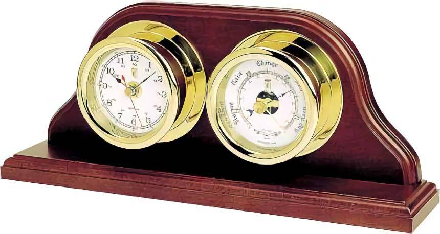 Примером тому настольный барометр и часы (хронометр, на морском языке). Два устройства, скомпонованные в латунных корпусах, вставлены в один деревянный короб, для изготовления которого использовано тиковое дерево. Именно так собирались навигационные приборы парусных кораблей. Изделие станет отличным подарком. Оно украсит любую квартиру, кабинет, выдаст правдивый прогноз погоды, покажет точное время. Стоит такой сувенир 12000 рублей. По мнению покупателей это лучший барометр для дома, отменный подарок юбиляру.