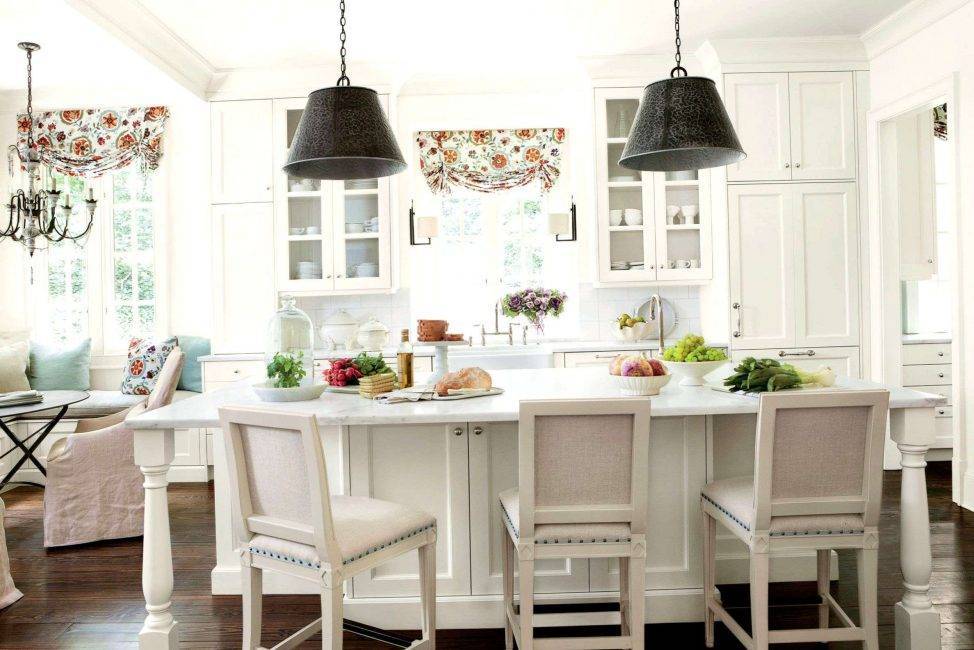 Освещение кухни должно быть традиционным, без модного точечного освещения. Подумайте о классической массивной хрустальной люстре, нескольких лампах, размещенных в разных зонах, и стоячий светильник для локального мягкого света.