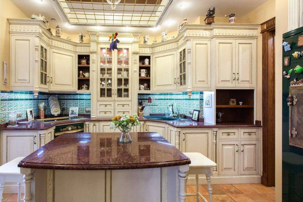В центре помещения должен стоять стол, а по стенам нужно развесить многочисленные шкафчики, полочки и ящички. Важным элементом декора станет плита в старинном стиле. Дополнят интерьер современные приборы, стилизованные под старину, а также мойка из керамики и аккуратный смеситель.