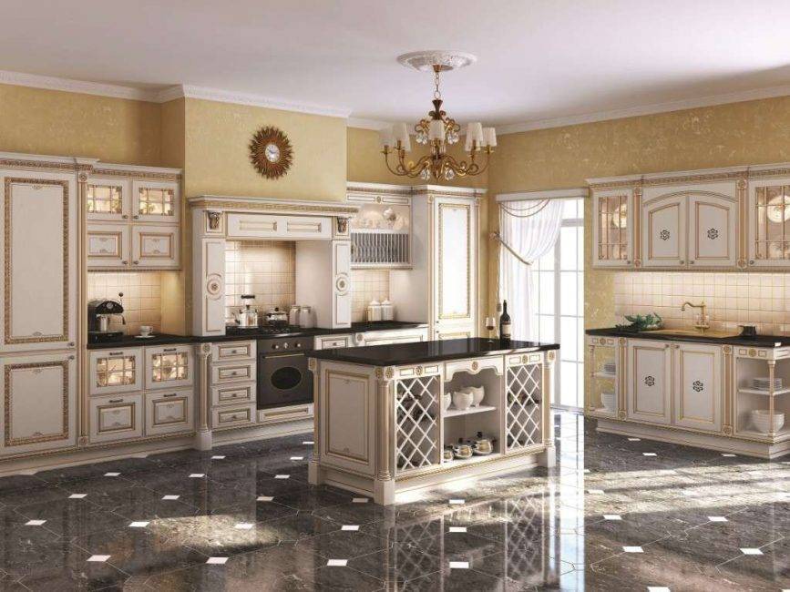 Интерьер кухни основан на принципах симметрии и функционального зонирования. Центр комнаты обычно занят большим столом, круглым или овальным. Он может быть использован для готовки (особенно если вы установите подвесную полку над ним). Остальная мебель, плита, духовка или другой соответствующий блок встроены в стены.