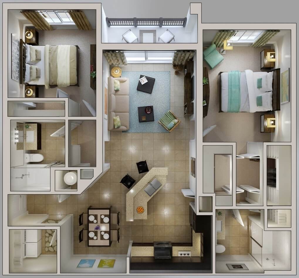 Эта практичная планировка трехкомнатной квартиры площадью 110 квадратных метров имеет две спальни, в каждой из которых есть ванная комната и гардеробная. Кухня не имеет окна, но спроектирована в американском стиле – с островом и столовой на четыре персоны. В гостиной двери на балкон решены в формате дверей-слайдеров со стеклами от пола до потолка.