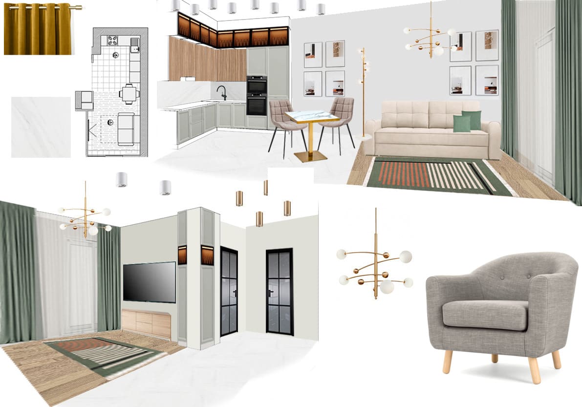 В гостиной на пол уложили французской ёлочкой дубовую паркетную доску. Для стен выбрали светло-серый оттенок, который выгодно подчеркнули однотонными портьерами в более тёмной гамме.