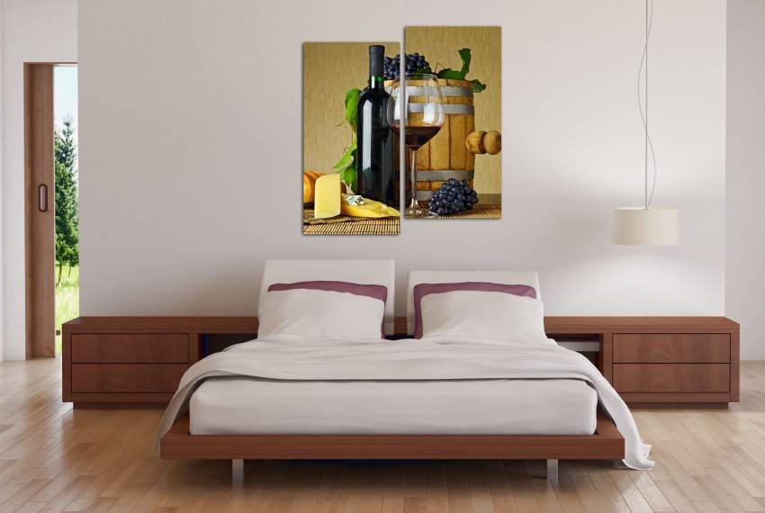 В гостиной картины традиционно вешаются над диваном, но не обязательно. Их размеры не должны превышать 2/3 части свободного пространства стены, одного полотна – половины. Требований к положению в других комнатах нет, разве что на кухне – вдали от места приготовления еды и за стеклом, чтобы предотвратить попадание загрязнений на поверхность холста.