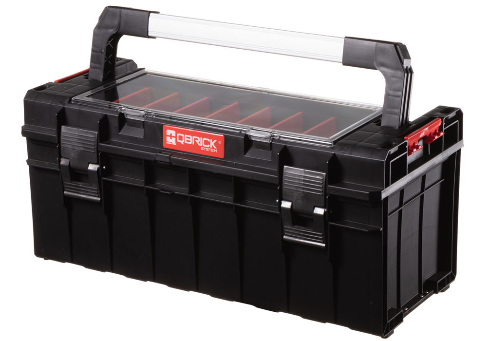 Представляет собой переносную классическую модель, на крышке которой находятся два боковых органайзера. Между отсеками имеются перегородки. Такая конструкция дает возможность хранить элементы крупной оснастки и мелкие метизы.
