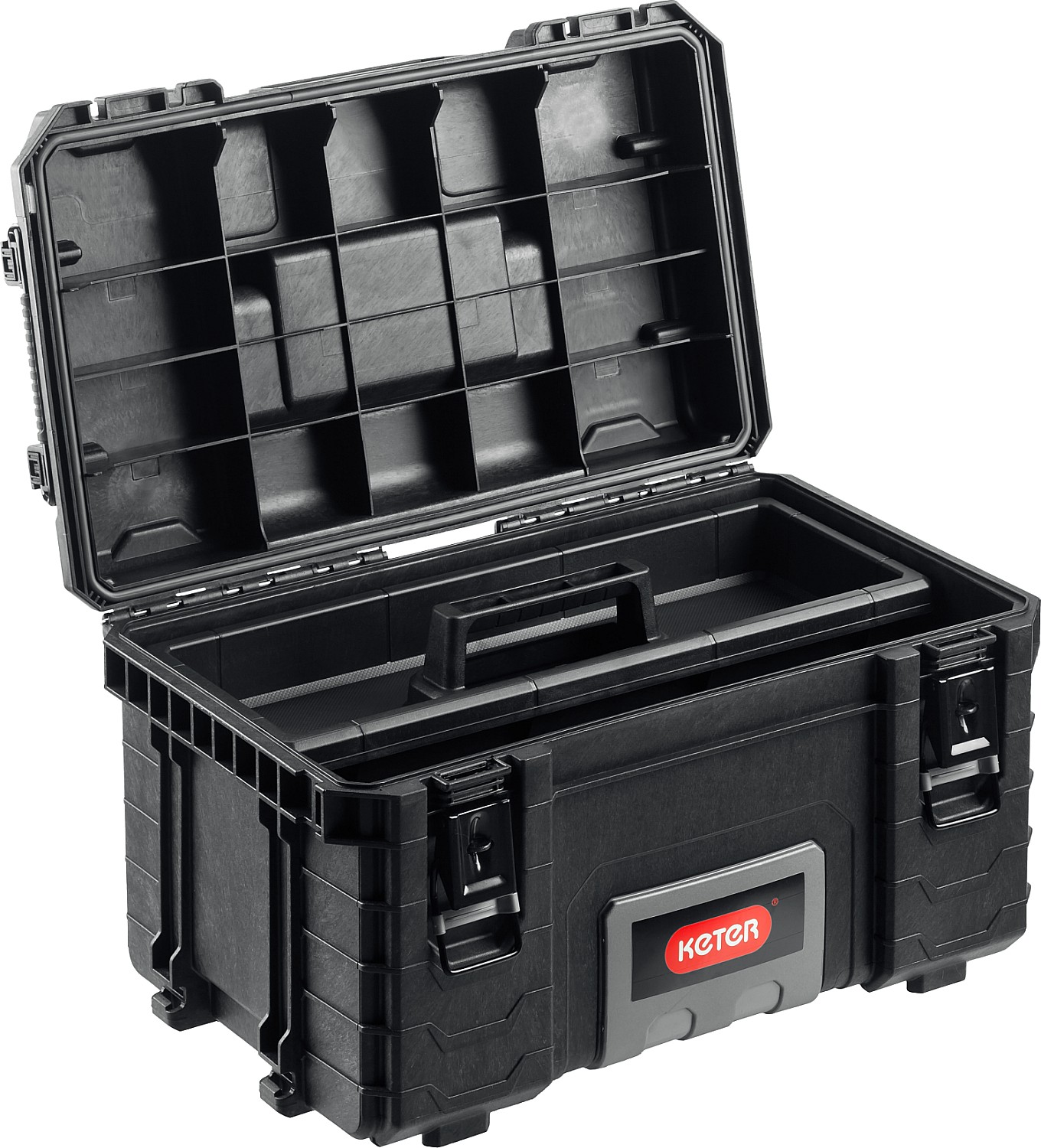 Продукция израильского бренда изготовлена из полипропилена, укомплектована телескопической ручкой. Бокс хорошо защищен от влаги и пыли уплотнителями, что делает надежным транспортировку электроинструмента. Верхняя крышка фиксируется в поднятом положении с помощью упоров. Для расположения снаряжения предусмотрены встроенные отсеки.