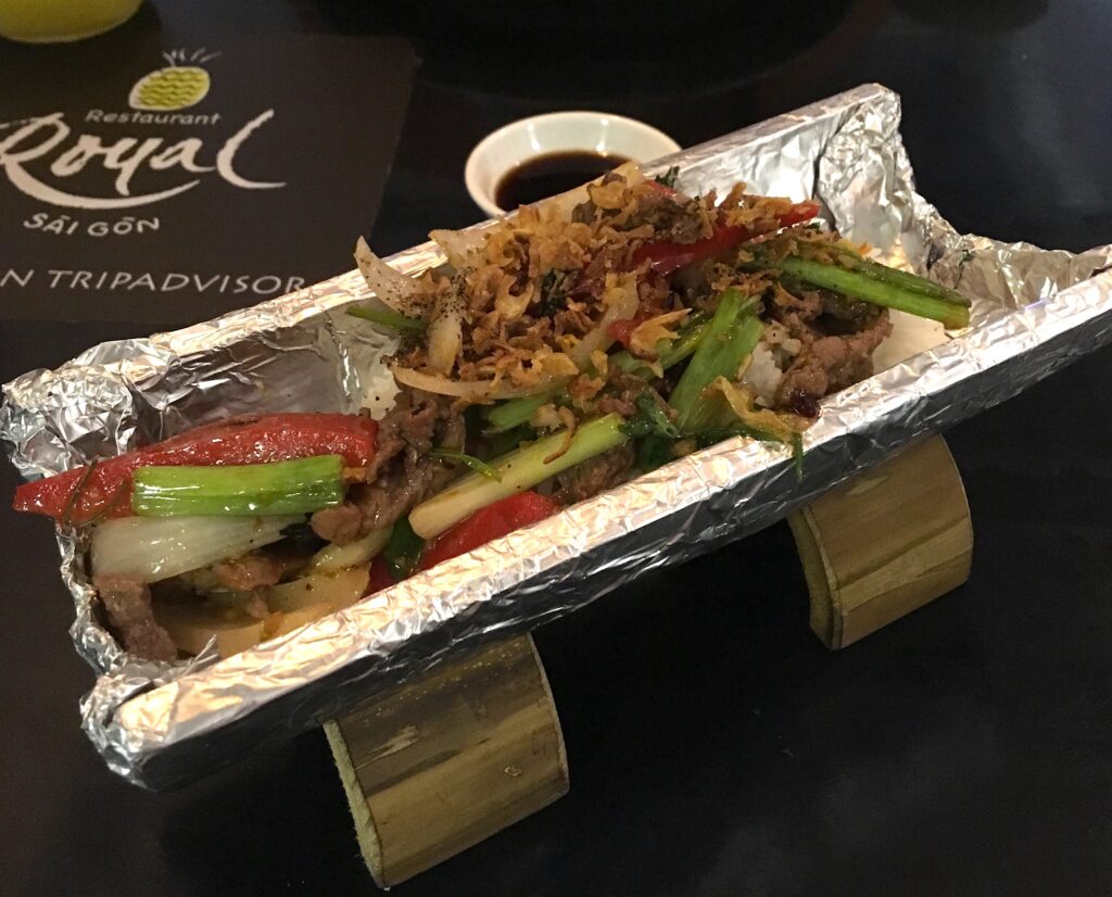 Я настоятельно рекомендую заглянуть в кафе Royal Saigon по адресу 201 Bùi Viện и попробовать там мясо в бамбуке (ВНИМАНИЕ! Адрес этого кафе изменился, теперь их можно найти здесь — 40 Dang Thi Nhu). Очень вкусно!