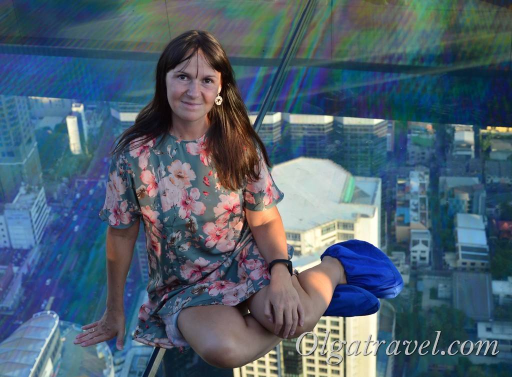 Несмотря на то, что я очень боюсь высоты, я надела бахилы, зажмурила глаза и ступила на стеклянный пол! Пару секунд для адаптации и понимаю, что стоять на стеклянном полу на высоте 310 м над Бангкоком не так уж и страшно! Не знаю почему, но заходить в стеклянный куб на смотровой площадке телебашни Менара в Куала-Лумпуре или на стеклянных участках на Sky Bridge на Лагкави мне было гораздо страшнее! А здесь, на стеклянном полу смотровой площадке в Бангкоке, я через несколько секунд совершенно расслабилась и спокойно перемещалась.