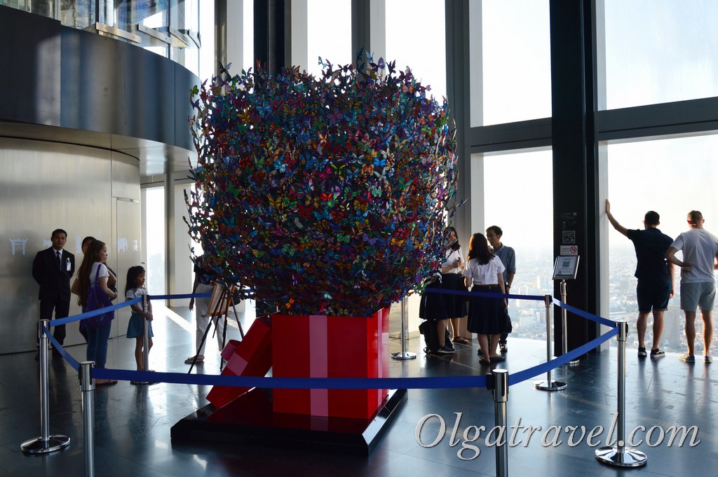 Вместо стен на площадке – огромные окна-витрины. Смотря в них чувствуешь себя птицей. Открытой площадки, как на небоскребе в Бангкоке или Тайпей 101, здесь нет.