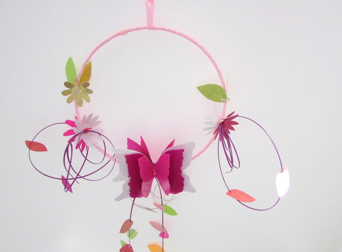 - На кольце делаем подвески, на концы которых вешаем наших бабочек. Попробуйте сделать такие поделки сами, и убедитесь, что изделия не только объемные, но и очень мягкие.