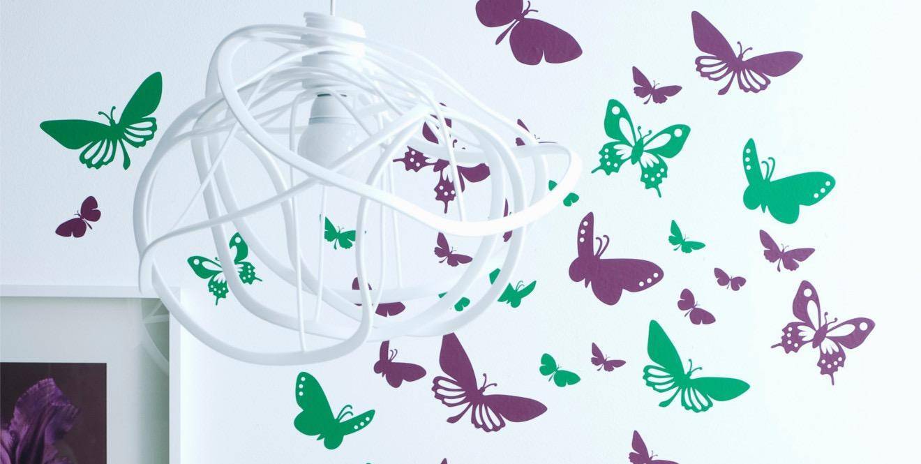 Для украшения стен в помещении можно использовать бумажные, картонные, тканевые, жестяные бабочки. Часто декорируют обоями, фигурками, выполненными техникой оригами. Поделки могут быть плоскими, объемными, однотонными, разноцветными. Для создания красивого изображения нужно подобрать хороший трафарет.