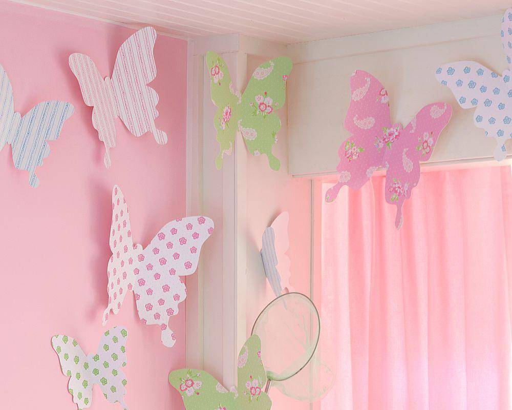 Самым доступным способом декорации стен есть использование бумаги. Украшения печатаются или рисуются на бумаге. Также красивый декор можно вырезать в виде различных завитушек. Бумажные изделия легко крепятся к стенке в любом положении. Крылышки поделок красиво трепещутся под воздействием потоков воздуха. Если украшения надоели, их можно легко снять не сожаления потраченного времени и денег.