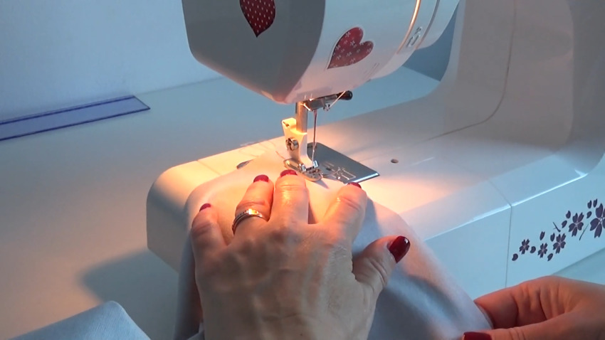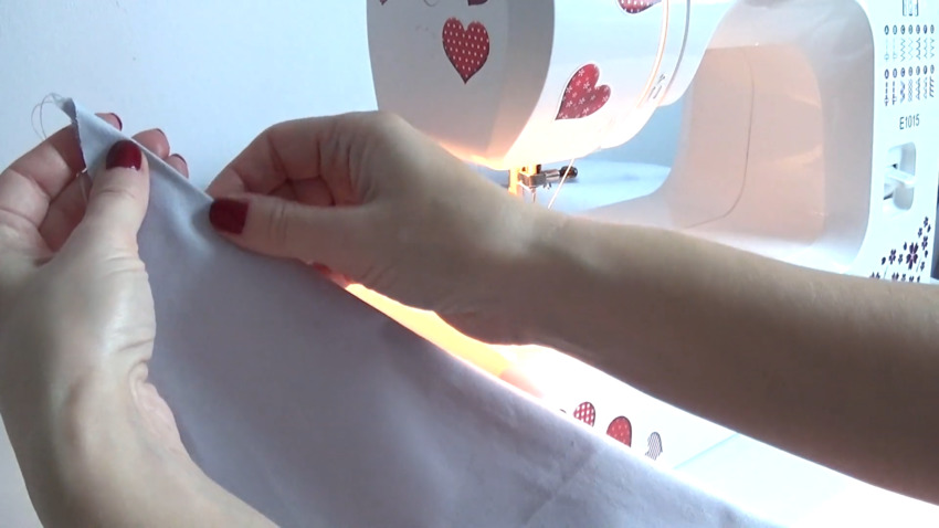 | 4 | ![]() | На верхней части сделайте отступ 1 см и прострочите, не подгибая ткань и оставив немного нити. |