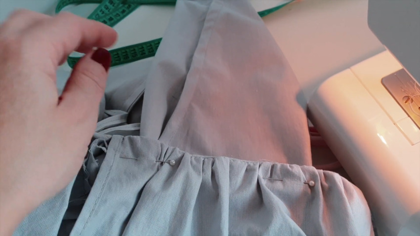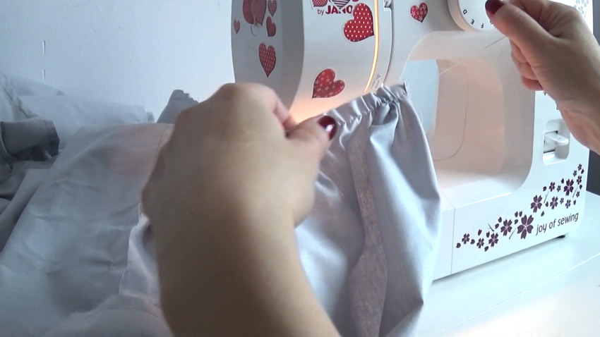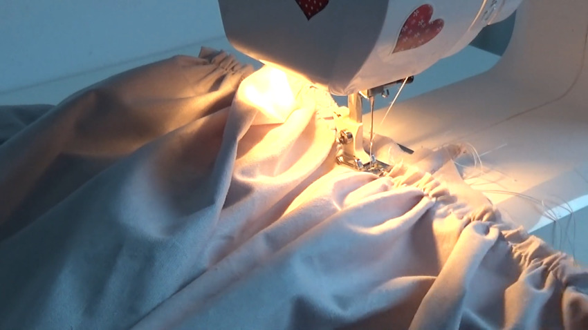 4) На верхней части заготовки отмечаем две линии на расстоянии 5 и 20 см от края. Затем при помощи иголки и нитки собираем верхние края ткани так, чтобы их длина равнялась 1 м.