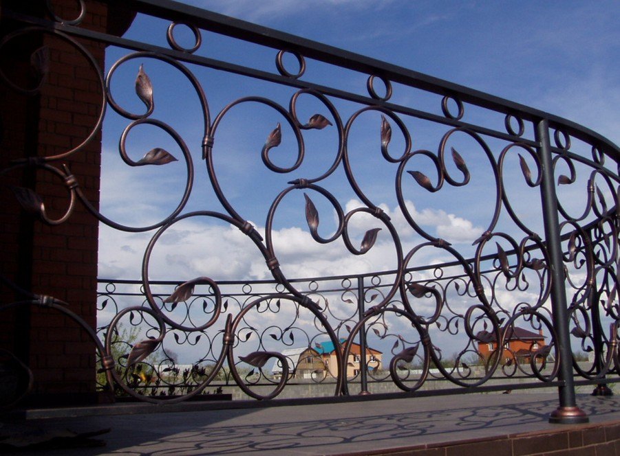 Широко распространены перила из чугуна, изготовленные методом литья или ковки. Они отлично сочетаются с любым архитектурным стилем. Тяжелый металл в умелых руках может преобразиться в легкие конструкции в виде растений, орнамента, народных мотивов.