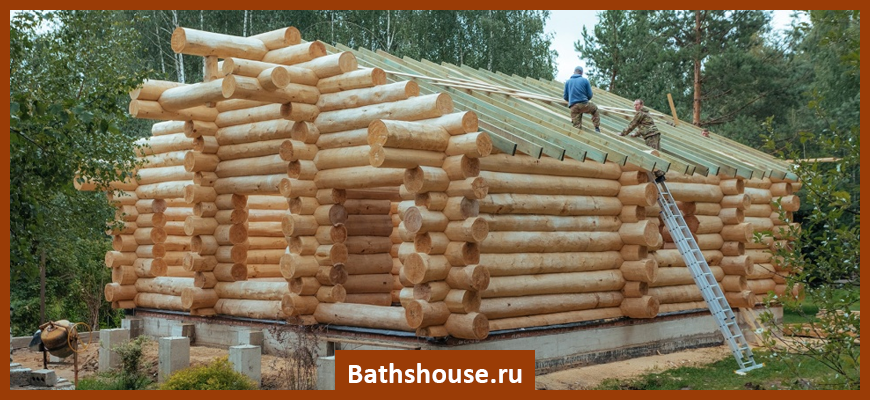 После возведения стен при помощи металлических скоб монтируются стропила. Крыша бани чаще всего имеет двускатную форму. В этом случае стропила опираются на стены, а вверху соединяются в конек. На стропила устанавливается обрешетка, затем паро- и гидроизоляционные слои, утеплитель. В завершение монтируется кровля.