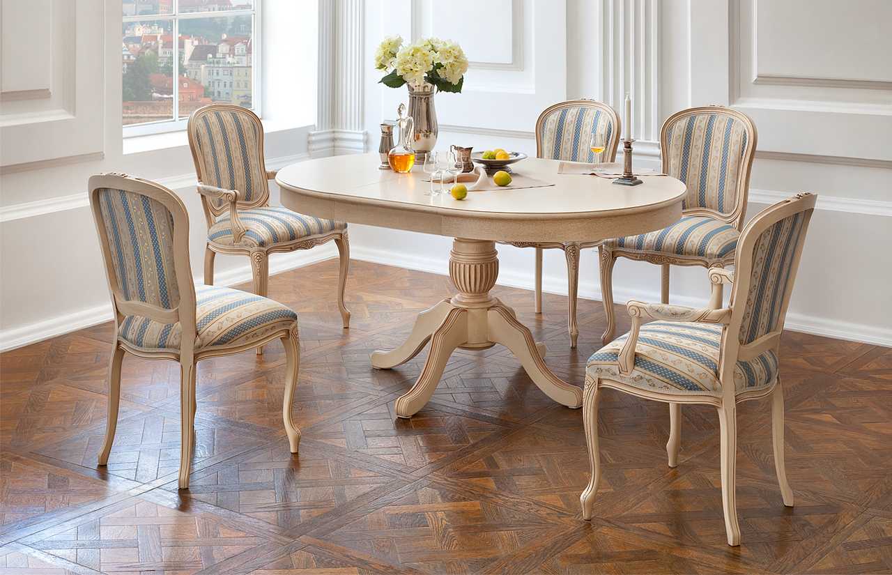 В столовой рококо или барокко роскошно будут выглядеть из темной древесины, обтянутые расписанной натуральной кожей. Гостиную-прованс украсят высокие табуретки из ротанга (испанского тростника) – комната станет экзотичной, теплой и легкой.