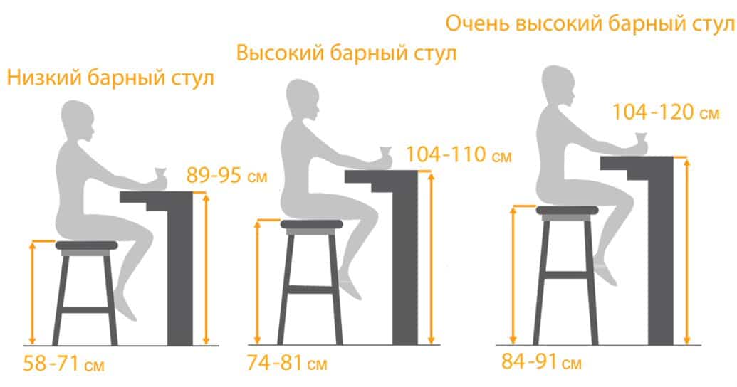 У барных стоек высота стула будет другой. Здесь также нужно учитывать уровень поверхности, на которой вы будете сидеть.