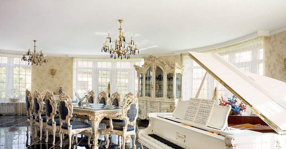 Должно создаваться впечатление изобилия, перебора во всем. Но нужно учесть, что вся пафосная обстановка должна выглядеть красиво, гармонично и передавать атмосферу исторического стиля, а не быть нагромождением старинных предметов роскоши.
