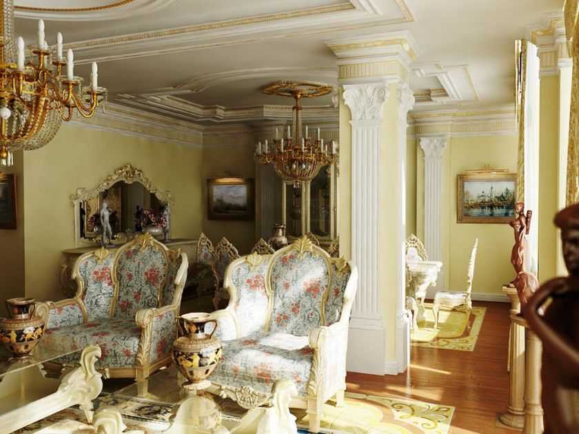 - Декоративность отделки. В дизайне используют сложную лепнину, античные статуи и колонны, картины, фрески и гобелены. Деталей и мебели настолько много, что интерьер напоминает музей.