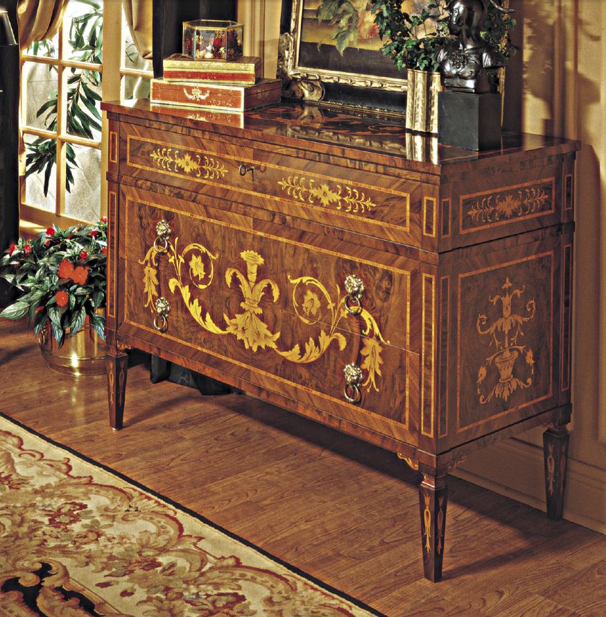 Комоды – немного выгнутые вперед, с двумя-тремя ящиками. Иногда был второй ярус с двумя дверцами.