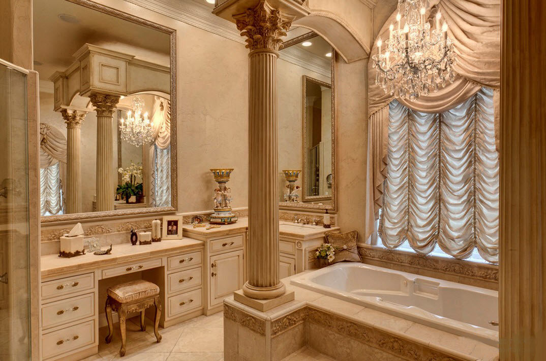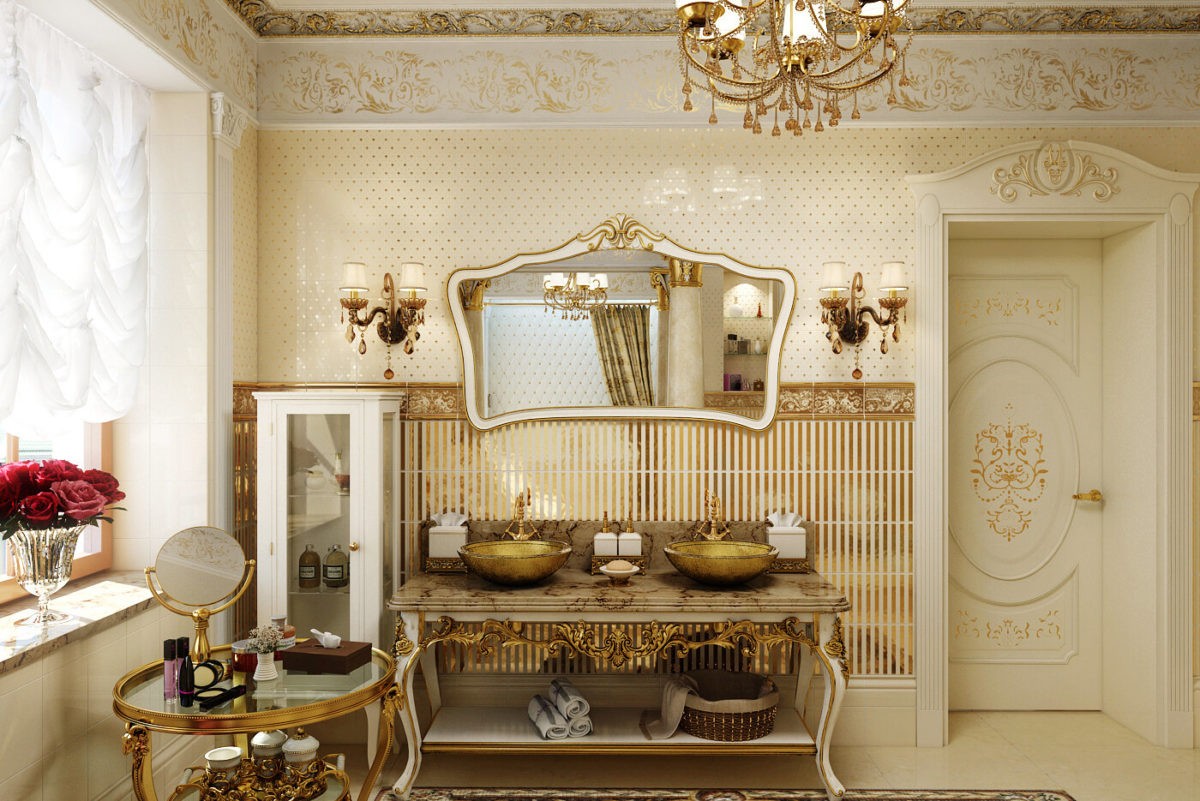 Центральное место в ванной комнате занимает изящная и плавная ванна. Она стоит на бронзовых ножках, или обкладывается бежевой мраморной плиткой. Далее гость заметит необычный смеситель, причудливую зеркальную раму и настенные светильники оригинальной формы.