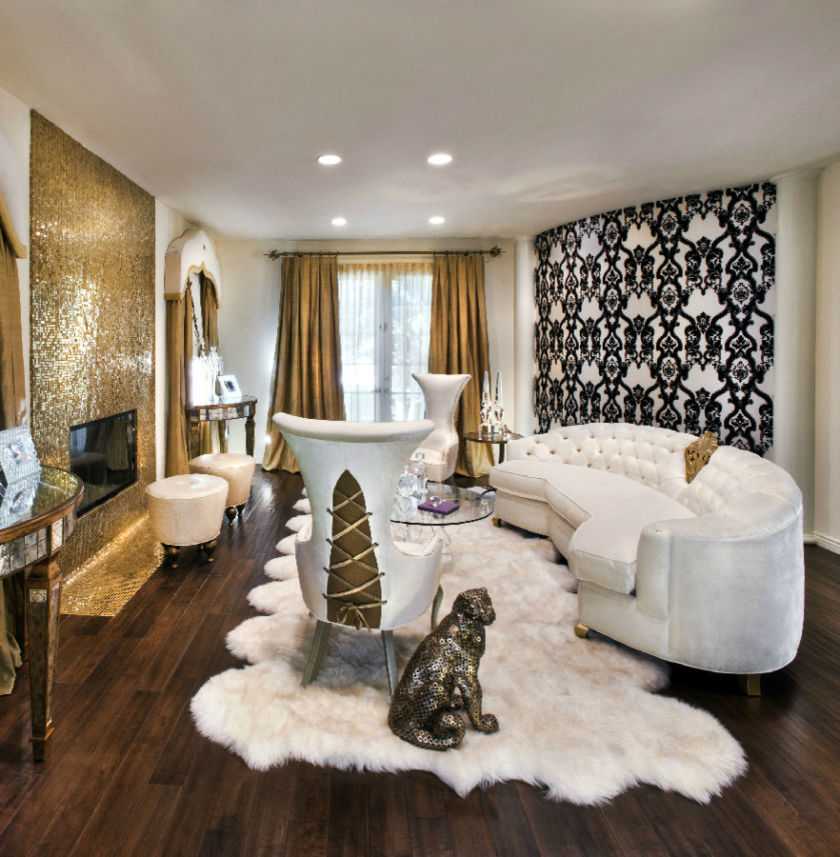 Но, если данный стиль очень импонирует, то можно внести некоторые акценты, как в этом роскошном стиле, обыграв гостиную в золотой гамме с присущими барокко извилистыми линиями и узорами.