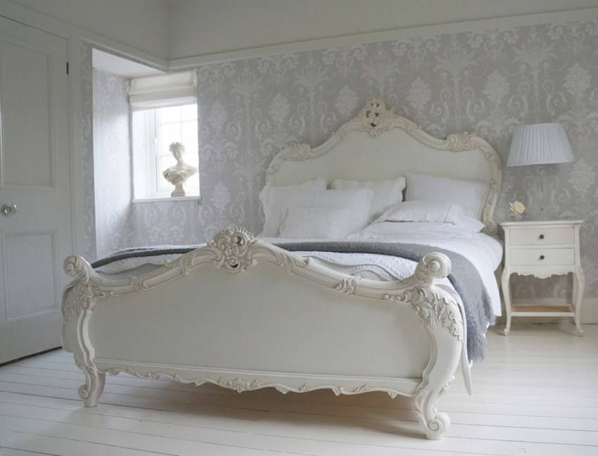 Удивительно, но нежные рисунки в пастельной гамме прекрасно смотрятся в белой спальне. Не мрачно, не безлико – так, как надо. Кружева, искусственно состаренный шкаф, выкрашенный белой краской, добавят нежности и утонченности.