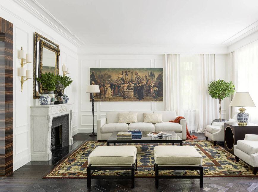 Классика. Антикварная мебель из темной древесины с белоснежной обивкой – это идеальное решение, которое позволит сделать интерьер более светлым и просторным, современным и жизнерадостным. Дополнить ансамбль поможет мраморный камин и белая штукатурка. Если же решено, что белой будет мебель гостиной, то лучше всего она будет смотреться на фоне теплых и пастельных тонов. Также для передачи цвета можно использовать белое ковровое покрытие или журнальный столик.