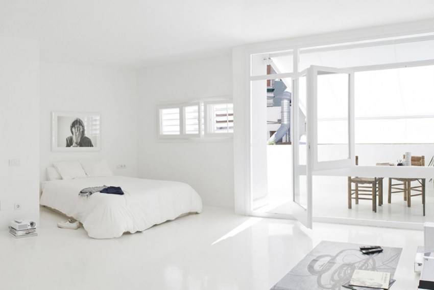 Интерьеры, полностью оформленные белым, – смелая идея. Они могут раздражать и напоминать больничные палаты. Они требуют продуманного декорирования. Сырые белые стены могут быть утеплены деревом и с сильными акцентами темно-синего, фуксии или красного цвета.