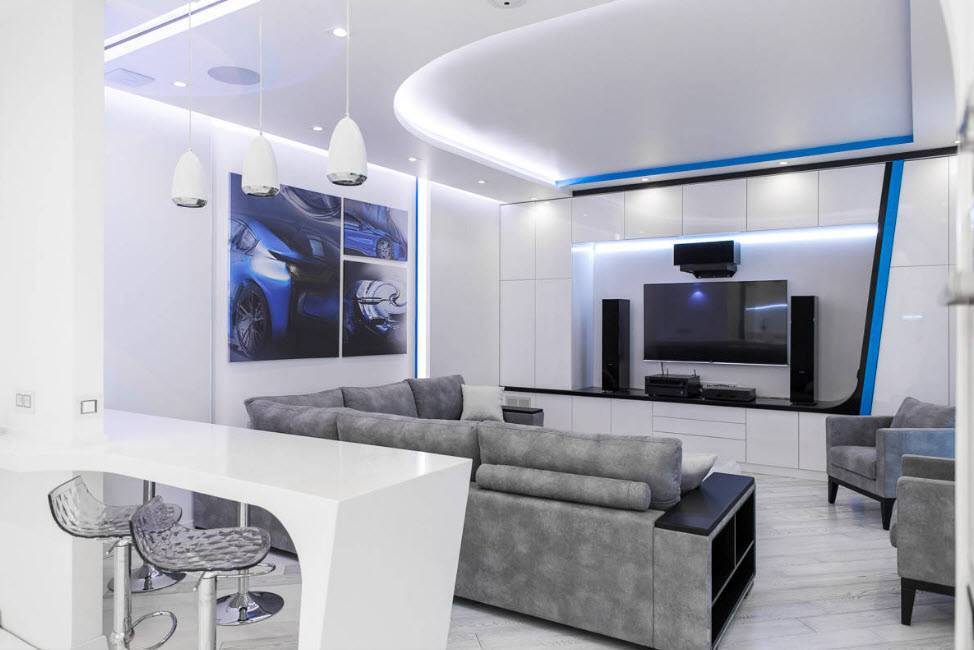 Хай-тек – стиль, который служит полной противоположностью привычным канонам в мире дизайна. Жилище, оформленное в стиле хай-тек, напоминает высокотехнологичный дом будущего, для создания интерьера которого используют ахроматические цвета. Для визуальной коррекции пространства используют зеркала и стеклянные поверхности, многоуровневые потолки и сложные системы освещения. Светлая отделка стен отражает много света и гармонично дополняет металлическую и хромированную мебель.