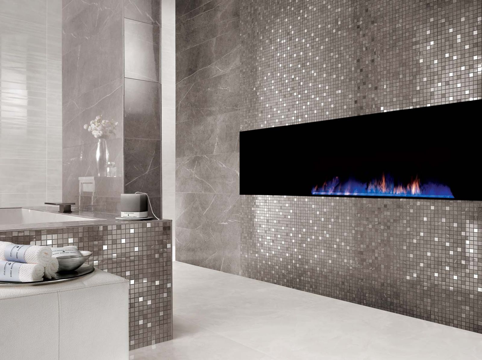 Является достаточно эффектным выбором, привносящим в интерьер интересные штрихи. Серебристая мозаичная плитка, одинаково хорошо смотрится, как при полном, так и при фрагментарном декорировании поверхностей.