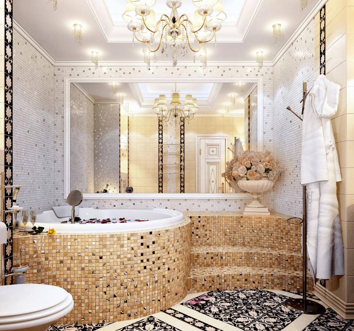 Вариантов отделки ванной может быть много. Выбор цвета и орнамента в первую очередь зависит от формы ванной комнаты, её размера и высоты потолков.