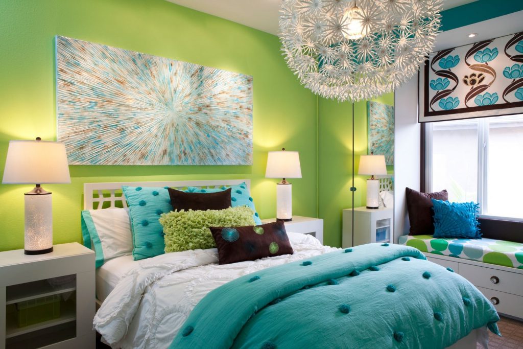 Например, хорошо смотрятся светло-зеленые и синие предметы на белом фоне. Старайтесь не использовать очень насыщенные сорта, особенно в спальне.