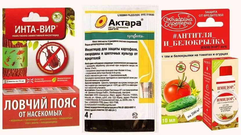 - «Актара» — содержит тиаметоксам. Через 15 минут после обработки насекомые прекращают питание и в течение суток гибнут. В продажу поступает в виде водно-диспергируемых гранул и концентрированной суспензии. Малоопасен для человека. Опасен для пчел. Используется для полива под корень и для опрыскивания растений. Применяется однократно. Урожай рекомендуется собирать не ранее, чем через три дня после применения препарата.
