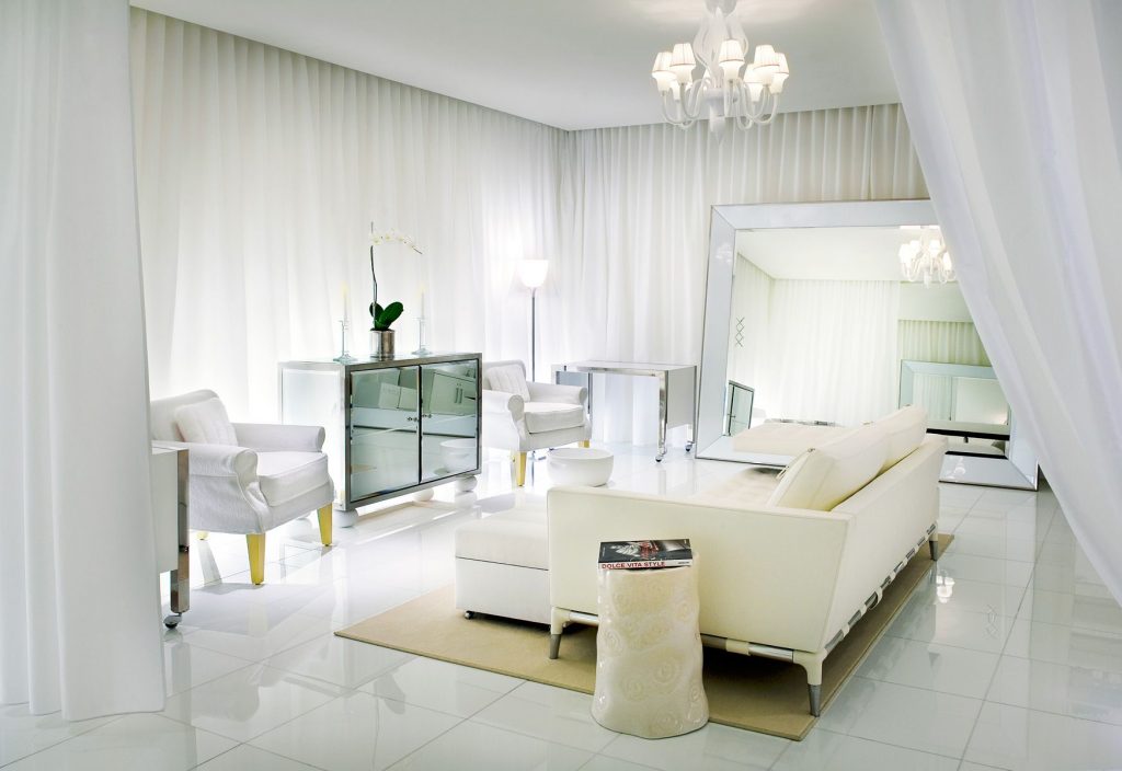 Гостиная является лучшим местом для использования белых штор. В роскошные помещения следует подбирать плотные ткани с блестящей поверхностью; для лаконичного дизайна лучшим решением будет применение матовых полотен; романтичный вид гостиной придадут прозрачные занавески.