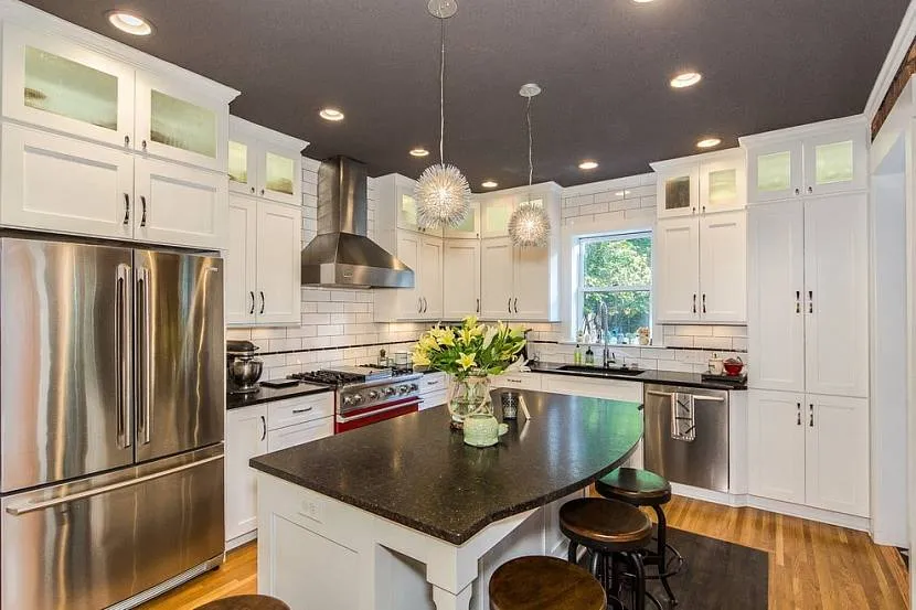 Для этой части жилья прекрасно подходят белые потолки, особенно глянцевые. Они гармонируют с любыми гарнитурами и техникой. Излишнюю строгость убирают градиентным оформлением, например, в пастельных тонах. При достаточной высоте стен эффект можно углубить многоуровневой конструкцией. Но если для обстановки выбрана деревянная мебель, то лучше предпочесть матовые одноуровневые поверхности.