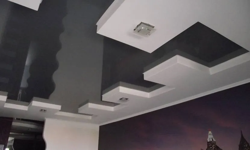 На фото за основной цвет двухуровневого потолка взят черный, а вставка из гипсокартона окрашена в белый цвет.