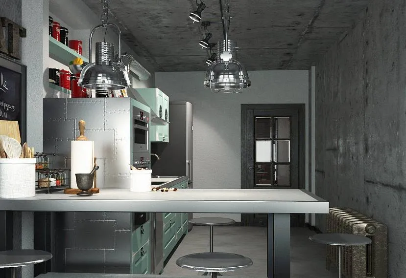 Бетонный потолок, переходящий в стену, выглядит смело на современной кухнеИсточник potolok.expert