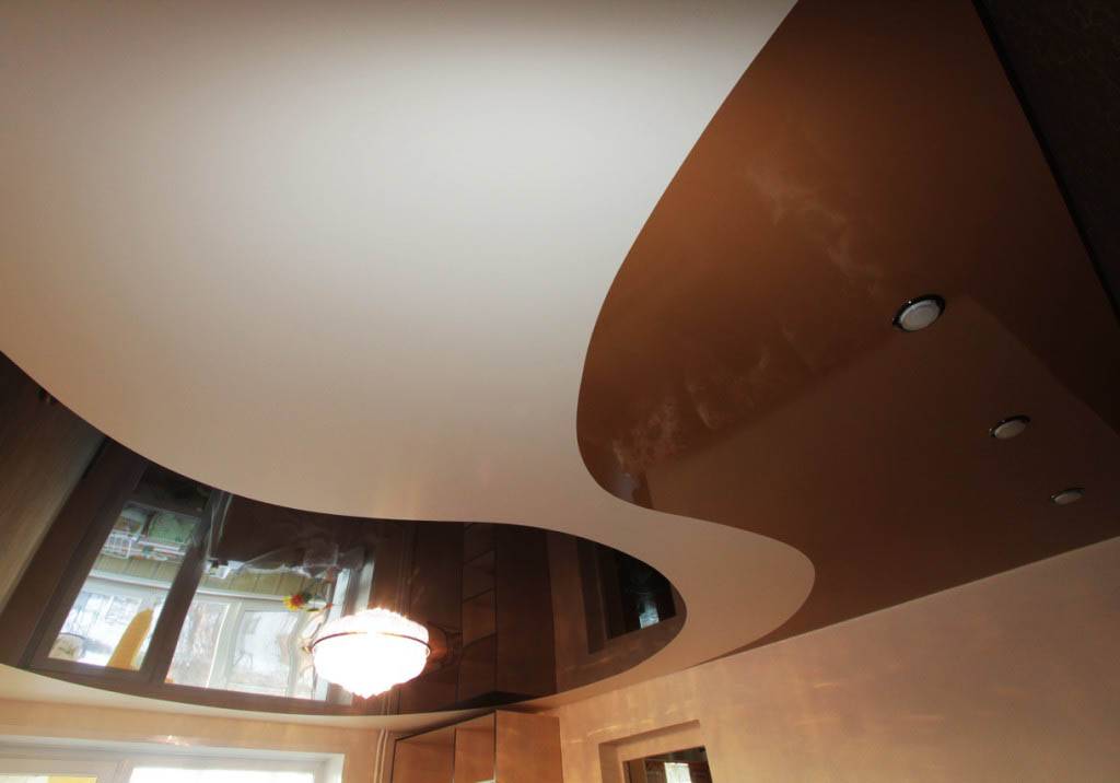 Некоторые примеры удачного выбора цветового сочетания двухцветных натяжных потолков показаны на фото ниже.