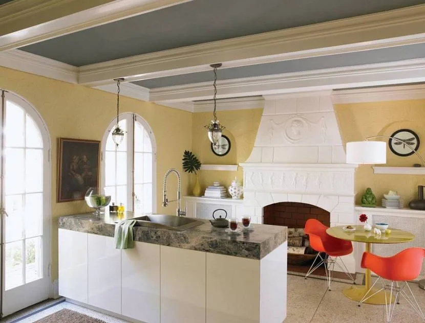 Желтый благоприятно воздействует на психику человека, активизирует мыслительные процессы, поэтому будет прекрасным решением для оформления потолка в рабочем кабинете.