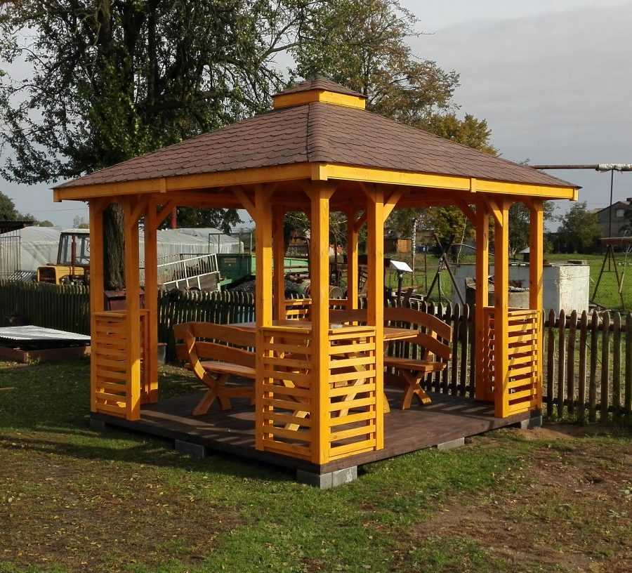 При возведении деревянной беседки своими руками помните о высокой пожарной опасности и гигроскопичности этого материала.