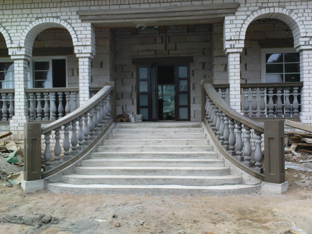 | Отделка бетонного полукруглого крыльца выполняется, когда бетон окончательно окрепнет. Для отделки применяют уличные влагостойкие материалы повышенной прочности. |
