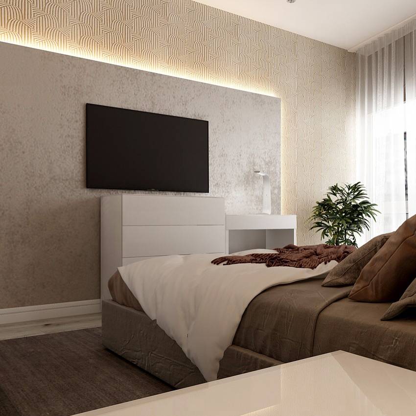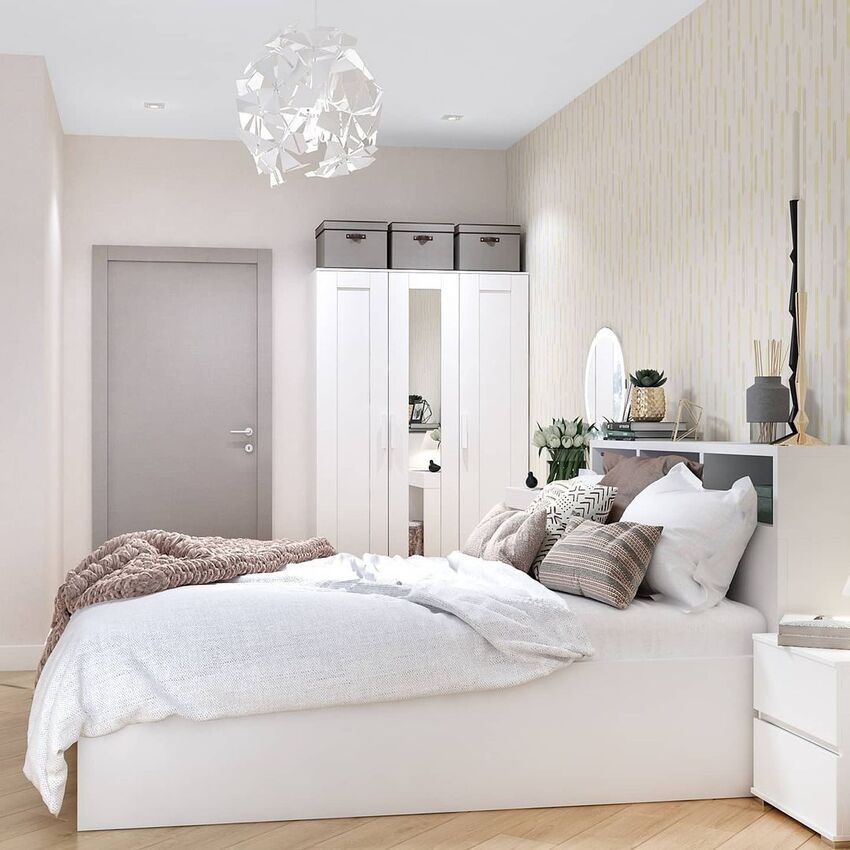 Он хорошо справляется с визуальным расширением пространства посредством добавления шкафов, прикроватных тумб белого цвета.