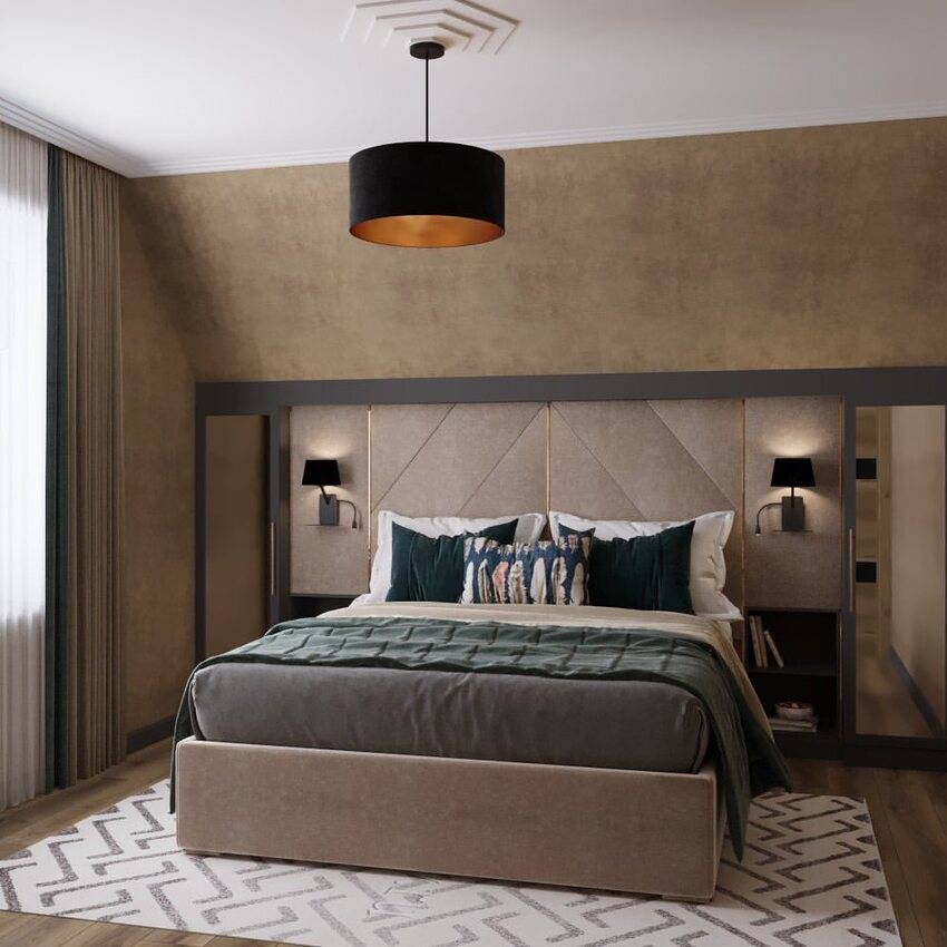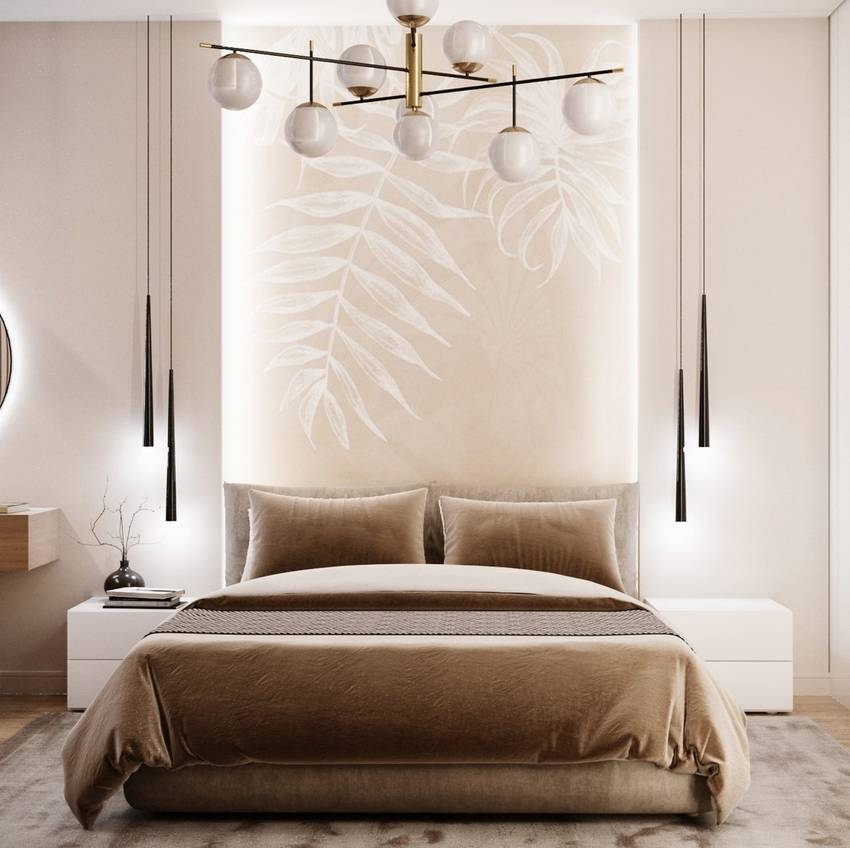 Монохромность дизайна легко разбавляется другими цветами, различными орнаментами и узорами. Их можно акцентно распределить на поверхности потолка и стен, постельных принадлежностях, гардинах. Профильные специалисты приветствуют использование контрастных цветов при оформлении дизайна современной бежевой спальни.