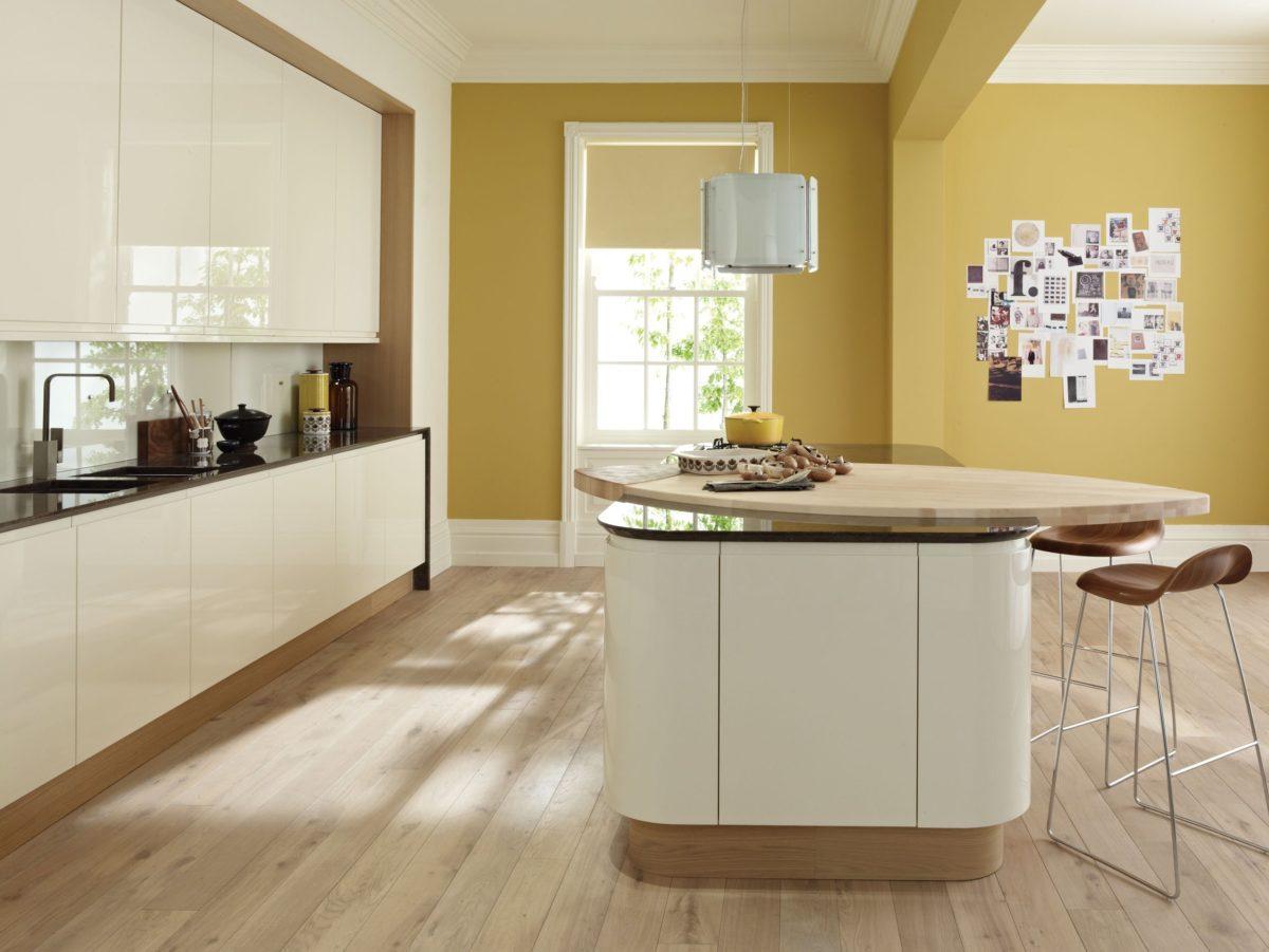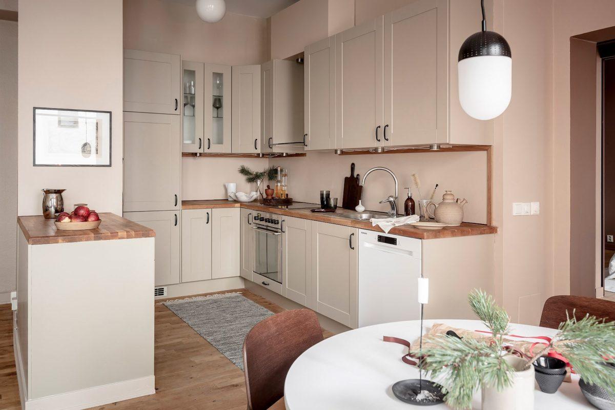 Беж отлично подходит скандинавскому дизайну и эко-стилю. Стены делаются светлыми и однотонными, гарнитур выполняется из светлого дерева. Столешница может быть стеклянной или каменной. В таком интерьере уместны бамбуковые шторы, декор из натуральных материалов.